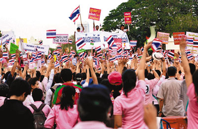 據(jù)香港《文匯報》報道,泰國反獨裁民主聯(lián)盟(“紅衫軍”)曼谷的示威活動持續(xù)近3星期,今天(3日)將再次舉行大規(guī)模反政府活動,要求總理阿披實解散國會下院。約3000名反對紅衫軍的群眾昨日(2日)身穿粉紅色衫,在曼谷倫披尼公園集會,反對“紅衫軍”的解散國會及修改憲法等要求。