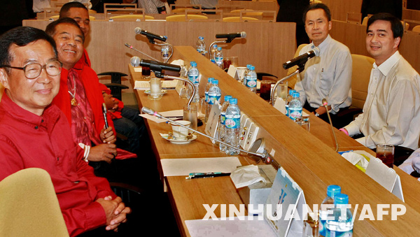 3月29日,泰國總理阿披實(shí)(右一)在曼谷會(huì)見“紅衫軍”代表。泰國總理阿披實(shí)與“紅衫軍”代表當(dāng)晚舉行的第二輪談判仍未能就解散國會(huì)下議院的時(shí)間達(dá)成協(xié)議。新華社/法新