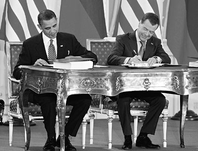 據香港《文匯報》報道,美俄經過1年困難重重的談判,7日于捷克布拉格簽署削減和限制進攻性戰略武器的新條約(見圖)。雙方均聲稱這一條約是“歷史性”的,但分析指,兩國仍保留足以毀滅對方的核武庫,而且在導彈防御等問題上分歧依舊。
