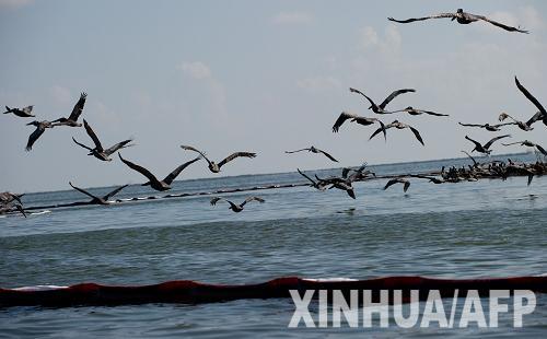 6月10日,在美國路易斯安那州的格蘭德艾爾,鵜鶘在墨西哥灣海面的隔油帶上飛翔。美國專家10日公布的初步調(diào)查結(jié)果顯示,在6月3日英國石油公司實施“切管蓋帽”工程之前,估計每天有2萬至4萬桶原油泄漏到墨西哥灣,大大高于此前的估計。新華社/法新