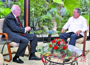 7日,古巴領導人勞爾·卡斯特羅(右)與到訪的西班牙外長莫拉蒂諾舉行會談。