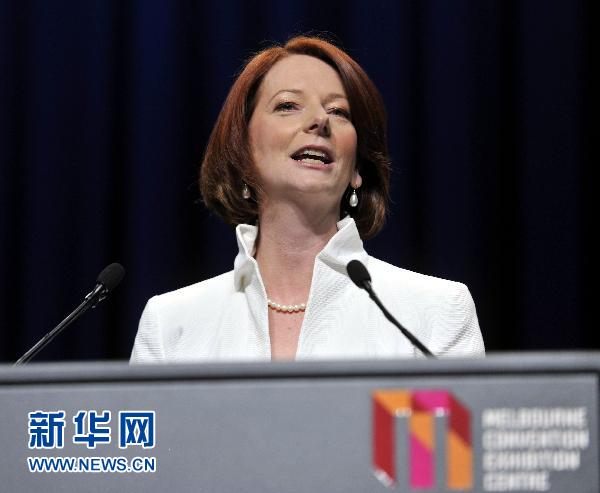 8月21日,在墨爾本會展中心舉辦的工黨“選舉之夜”上,澳大利亞現(xiàn)任總理朱莉婭·吉拉德向支持者發(fā)表演講。新華社記者黃曉勇攝