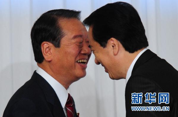 9月1日,在日本首都東京舉行的聯合記者會開始前,日本首相、執政的民主黨代表(黨首)菅直人(右)和民主黨前干事長小澤一郎抵達會場。新華社記者季春鵬攝