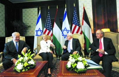 上午的會談結束后,內塔尼亞胡、阿巴斯在助手們和希拉里的陪同下當天下午繼續談判。