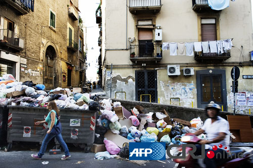 當地居民從一大堆雜亂的垃圾邊走過。(AFP/國際在線)