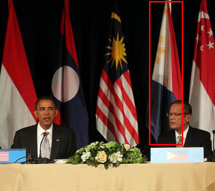 9月24日,美國總統奧巴馬在在紐約同東盟國家領導人舉行會晤。當時懸掛于菲律賓總統阿基諾三世身后的菲律賓國旗紅色在上、藍色在下,系倒掛。