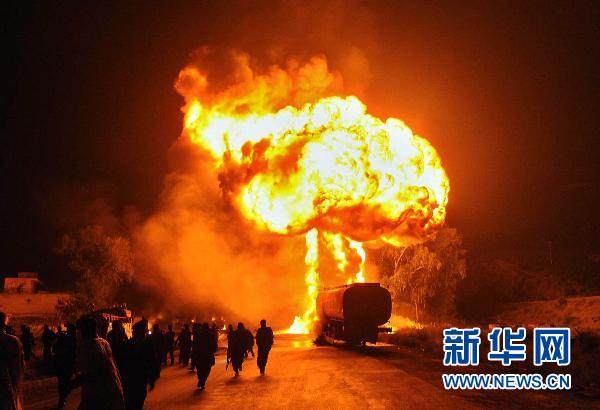 10月6日,在巴基斯坦西北部城市瑙謝拉,巴安全人員封鎖了油罐車起火現場。