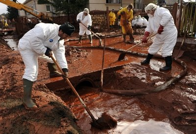 匈牙利工人正在清理廢毒水泄漏造成的淤泥(來源:美國媒體)
