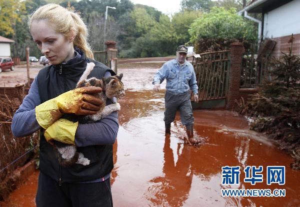 10月5日,在匈牙利首都布達佩斯以西150公里的一個村莊,當地居民抱著一只貓離開被有毒廢水覆蓋的地面。新華社/路透