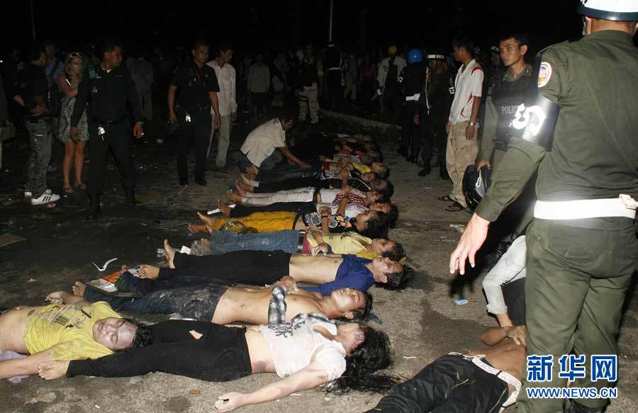 11月23日,在柬埔寨金邊,人們站在踩踏事件遇難者遺體旁。新華社發(披隆攝)