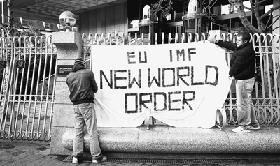 11月27日,愛爾蘭都柏林,民眾正在抗議政府的緊縮預算方案。圖中標語意為“歐盟、國際貨幣基金組織——新的世界秩序”,諷刺政府將不得不在政策制定上聽命于歐盟和國際貨幣基金組織。