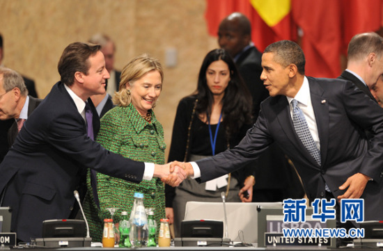 11月19日,在葡萄牙首都里斯本,美國總統(tǒng)奧巴馬(右)與英國首相卡梅倫(左)出席北約峰會首日會議時握手。新華社記者武巍攝。