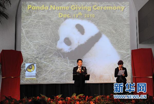 奧地利出生熊貓寶寶得名“福虎” 12月13日,在奧地利首都維也納的美泉宮動物園,中國野生動物保護協會秘書長臧春林(中)在命名儀式上致辭。當日,美泉宮動物園舉辦熊貓寶寶命名儀式,正式公布今年8月23日在這個動物園出生的雄性大熊貓幼仔得名“福虎”。福虎是在美泉宮動物園出生的第二只大熊貓,它的父母龍徽和陽陽曾于2007年8月產下一只名為福龍的熊貓幼仔。福龍深受奧地利人民的喜愛,而“福虎”這個名字既有祝福的寓意,又和它兄長的名字相應,是奧地利網民從“福虎”、“奧康”、“維興”三個名字中票選出來的。新華社記者徐亮攝