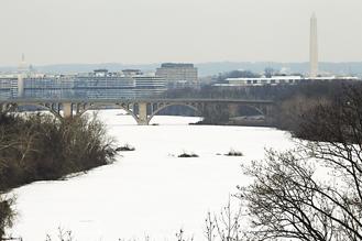 美國首都華盛頓的波多馬克河25日不但結冰,冰上還覆蓋白雪。