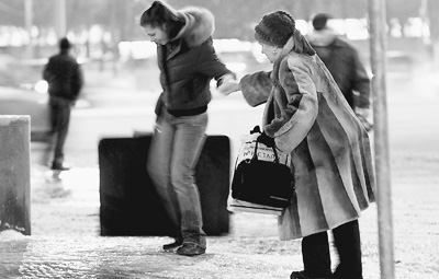 圖為莫斯科街頭的行人在結冰的路面上相互攙扶著行走。人民圖片