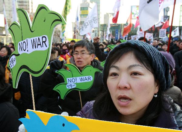 12月18日,在韓國首爾火車站,人們手舉標語,高喊口號,要求李明博政府下臺。當日,數千名韓國民眾在首爾舉行抗議,要求李明博政府下臺。韓國政府16日宣布將在18日至21日之間的某一天在延坪島海域舉行海上實彈射擊訓練。新華社發(樸真熙攝)