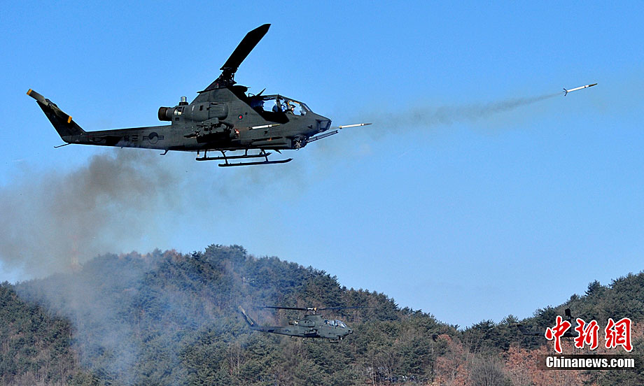1月6日,韓國陸軍航空兵所屬的AH-1S武裝直升機在延坪島進行實彈射擊演練。