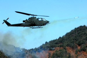 6日,延坪島,一架AH-1S直升機(jī)在演習(xí)中發(fā)射火箭彈。韓國(guó)媒體7日?qǐng)?bào)道,朝韓美三國(guó)近日均下調(diào)了“備戰(zhàn)”級(jí)別,朝鮮半島局勢(shì)出現(xiàn)緩和。