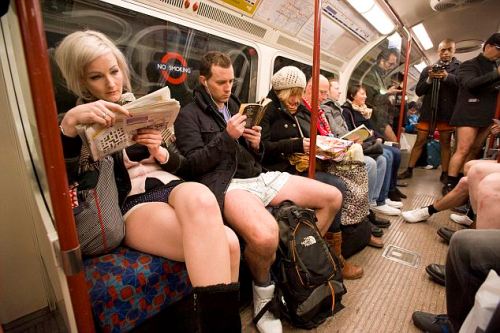 在坐上地鐵前,他們要先將褲子脫下并塞入包中,而后假裝若無其事的乘坐地鐵。組織者要求這些參與者們裝作互相不認識,制造“巧合”的感覺。