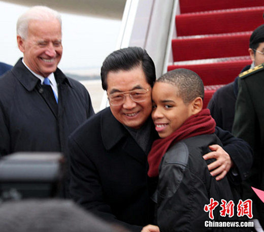 當地時間18日下午,中國國家主席胡錦濤乘坐的專機平穩降落在美國華盛頓安德魯斯空軍基地,對美國進行國事訪問。美國副總統拜登等高官赴機場迎接。一名美國兒童向胡錦濤獻花,胡錦濤親切地擁抱了這個孩子。中新社記者 張朔 攝
