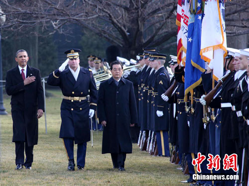 中國國家主席胡錦濤當地時間19日上午來到白宮南草坪,出席美國總統奧巴馬為他舉行的隆重歡迎儀式。圖為胡錦濤在奧巴馬陪同下檢閱儀仗隊。張朔 攝