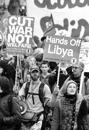 3月26日,在英國首都倫敦,抗議者打出反對干涉利比亞的標(biāo)語。