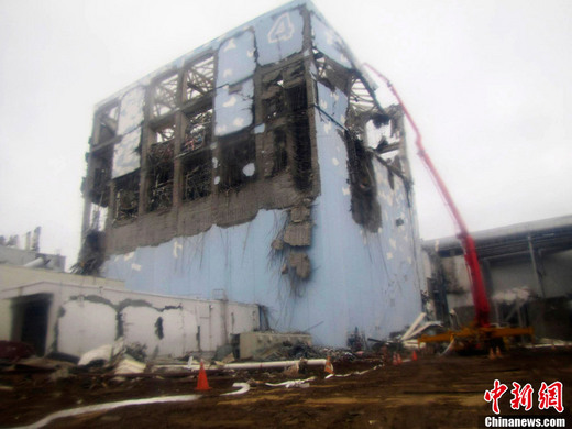 由東京電力公司3月22日拍攝,并于當(dāng)天公布的圖片顯示,工作人員正嘗試向福島第一核電站4號(hào)反應(yīng)堆進(jìn)行噴水作業(yè)。