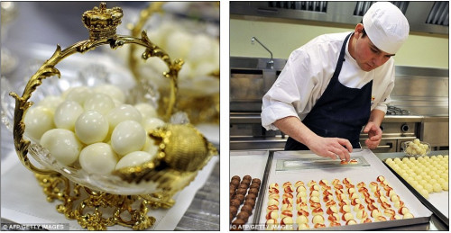 威廉王子與凱特的婚禮當天菜品種類豐富,藍色畫室(Blue Drawing Room)里有30根圓柱,餐桌是當時為拿破侖定制的
