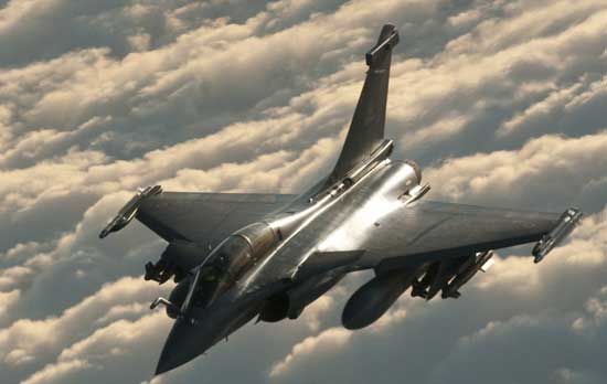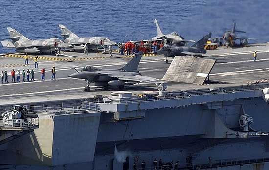 戴高樂號航母上的陣風艦載機起飛。