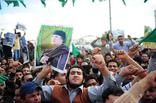3月23日,在利比亞貝尼沃利德,卡扎菲的支持者們參加示威游行。利比亞首都的黎波里當地時間23日晚遭到西方戰機襲擊,導致平民傷亡。阿爾及利亞、加納、意大利等國呼吁和平解決利比亞危機。新華社記者楊光攝