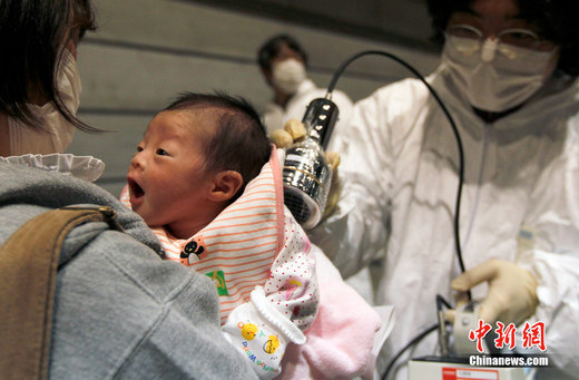 2011年3月31日,日本福島縣一個避難所內,出生于3月15日嬰兒Nagashima Rio正在接受核輻射檢測。她所在的避難所距離福島第一核電站大約70公里。而他所出生的醫院距離福島第一核電站只有約50公里。
