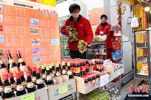 日本東京池袋華人商店貨物重新上架供應(yīng),不少市民儲(chǔ)備食品應(yīng)付突發(fā)事件。(資料圖)中新社發(fā) 洪少葵 攝