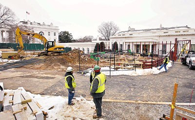 今年1月的圖片顯示,白宮西翼附近正在施工。