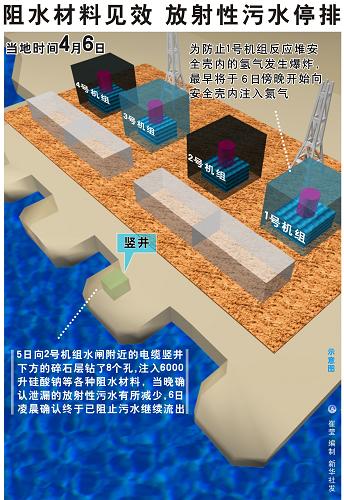 東京電力公司2日發現高放射性的污水從2號機組水閘附近電纜豎井的裂縫中流入海中,灌注混凝土以及吸水膨脹的高分子材料等封堵方法都未能奏效。5日,東京電力公司在電纜豎井下方碎石層中開鑿8個孔,注入6000升俗稱“水玻璃”的硅酸鈉等各種阻水材料,當晚確認泄漏的放射性污水量減少,6日早晨確認污水已停止外泄。