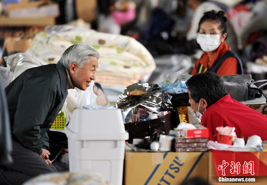 4月8日,日本天皇和皇后在避難所探望因核電站事故而從福島縣雙葉町疏散到埼玉縣的災民。