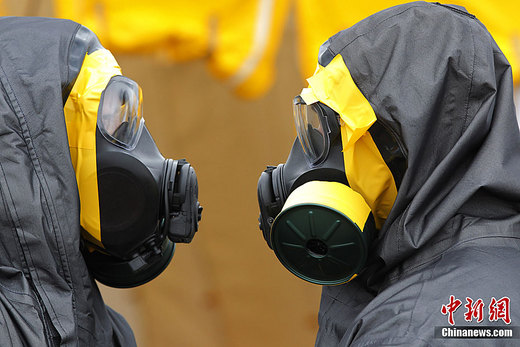 4月9日,日本東京,美國海軍陸戰(zhàn)隊(duì)的化學(xué)生物事件快速反應(yīng)部隊(duì)在橫田空軍基地進(jìn)行除污演練。