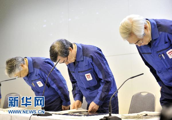 4月13日,在日本東京電力公司總部,東京電力公司社長(zhǎng)清水正孝(中)及兩名副社長(zhǎng)在新聞發(fā)布會(huì)上鞠躬致歉。當(dāng)日,東電在東京總部召開(kāi)新聞發(fā)布會(huì),社長(zhǎng)清水正孝在發(fā)布會(huì)上就福島核危機(jī)向公眾致歉。 新華社/法新