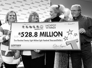田納西彩票公司首席執行官哈格羅夫(右二)向魯濱遜夫婦及女兒頒發巨款“支票”(圖片來源:新華/美聯)
