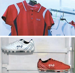 圖為朝鮮的代表性體育用品品牌“我的故鄉(xiāng)”推出的T恤衫(上)和足球鞋(下)(韓國(guó)《中央日?qǐng)?bào)》網(wǎng)站)