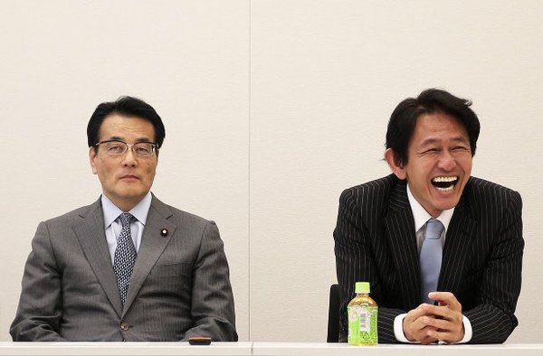 兩黨公布新黨名候選方案。維新黨前黨首、眾議員江田憲司(左)和民主黨籍前眾院副議長赤松廣隆(右)