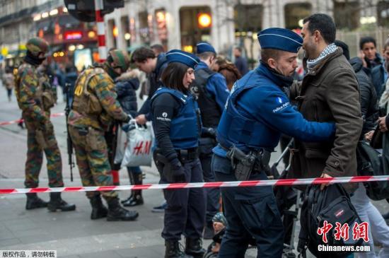 當?shù)貢r間2016年3月24日,比利時布魯塞爾,警察對進入地鐵站的乘客進行安檢。