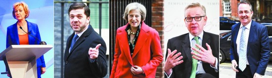 上圖:英國保守黨6月30日宣布,該黨5名下院議員將競選下一任黨魁,勝選者預計于今年10月接替卡梅倫出任保守黨新黨魁和新首相。從左至右分別為:負責能源事務的國務大臣安德烈婭·利德索姆、就業和養老金事務大臣斯蒂芬·克拉博、內政大臣特雷莎·梅、司法大臣邁克爾·戈夫和前國防大臣利亞姆·福克斯。