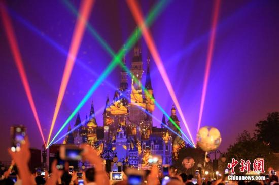 6月16日晚,美輪美奐的燈光煙花秀讓上海迪士尼城堡變得幻彩無比,成當日上海迪士尼開園最華美絢麗的表演之一,吸引數(shù)萬游客觀賞。中新社記者 潘索菲 攝