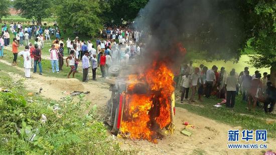 這是7月25日在印度北方邦珀多希的事故現場拍攝的著火的校車。據一名當地警方官員說,一輛校車與一列疾馳的火車25日早晨在珀多希的一個無人監控道口相撞,造成至少7名兒童死亡,12名兒童受傷。