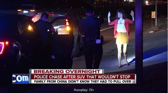 一名滿臉疑惑的中國女子首先下車,試圖與警方交涉,車內還有一名男子及一名男童,一家3口看到被警員持槍包圍后頓時被嚇呆。經警方盤問后,才知道涉事家庭是中國游客,不熟悉當地交通法例。當警方閃燈鳴笛時,他們并不知道自己被要求停車,才引發該場烏龍追逐戰,故沒有對他們作出處罰。