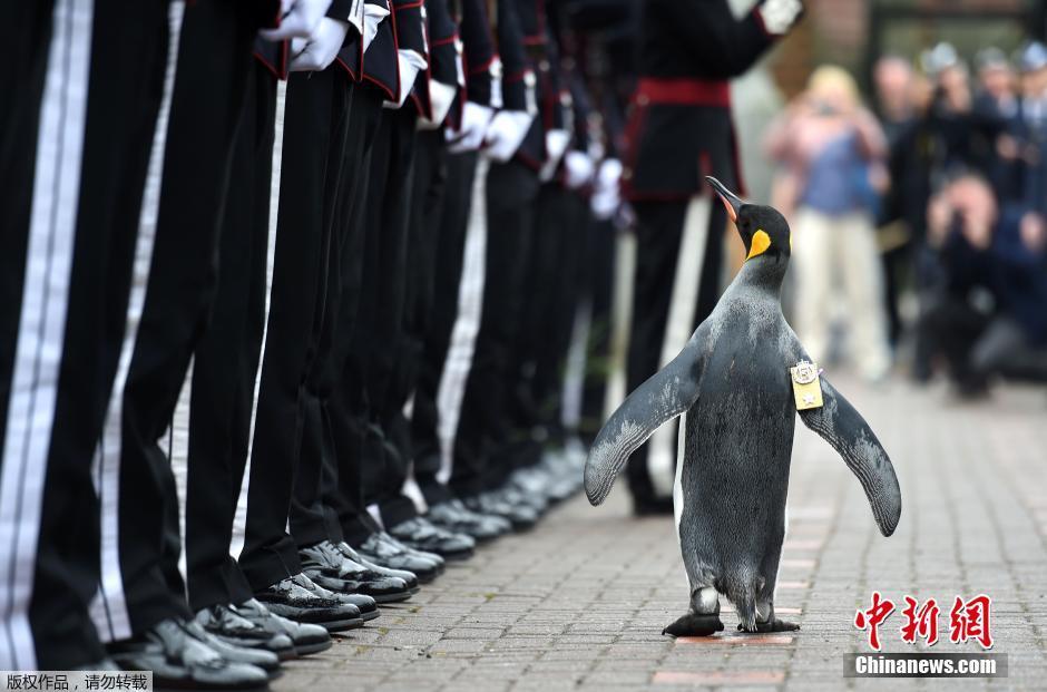 8月22日,在英國蘇格蘭首府愛丁堡,愛丁堡動物園的一只名為“尼爾斯·奧拉夫”的帝企鵝“檢閱”參加愛丁堡軍樂節的挪威國王衛隊。這只帝企鵝是挪威國王衛隊的吉祥物,2008年獲封挪威爵士。