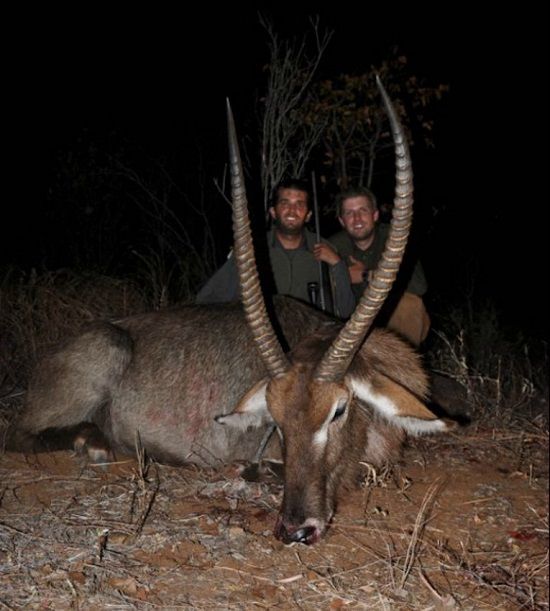 此前,我們經(jīng)常可以通過特朗普的兩個(gè)兒子(小唐納德Donald Jr.和埃里克Eric)在社交媒體上的照片看到他們打獵收獲的“戰(zhàn)利品”:其中有一張就是兩個(gè)人在非洲獵殺的豹子;另一張是小唐納德拿著一條他剛切下來的大象尾巴;還有則是兩個(gè)人微笑著站在美麗的水羚(waterbuck)角中間。
