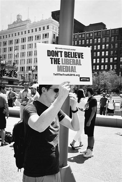 美國民眾在克利夫蘭街頭,高舉標(biāo)語抗議帶有偏見的媒體。