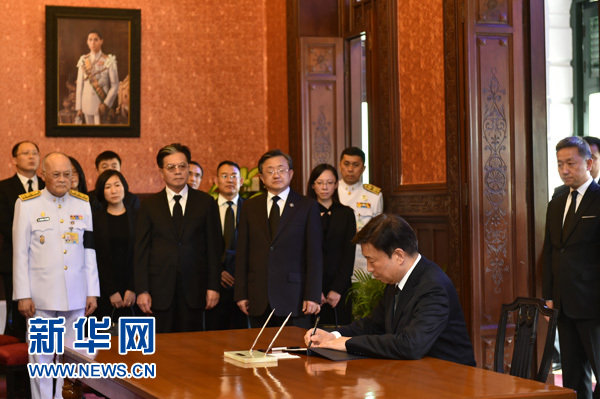 10月22日,在泰國曼谷大王宮,前來吊唁普密蓬國王逝世的習近平主席特使、國家副主席李源潮在吊唁簿上題詞。當日,習近平主席特使、國家副主席李源潮專程前往泰國吊唁普密蓬國王逝世。 新華社記者李芒茫攝