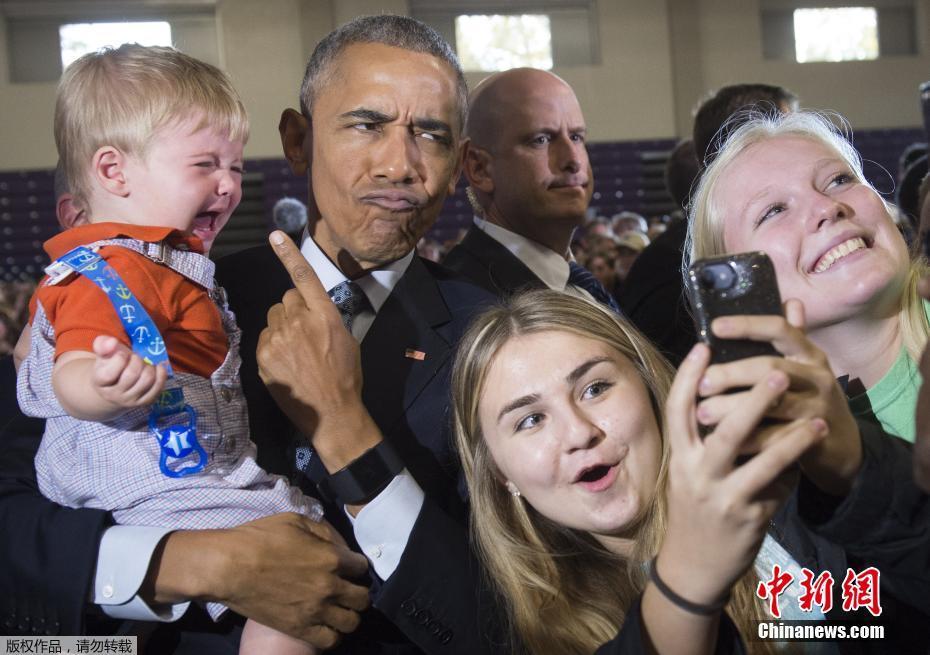 當地時間2016年11月1日,美國俄亥俄州,總統奧巴馬舉行集會演講,為民主黨總統候選人希拉里拉票。現場的一名小朋友吸引了奧巴馬的注意,他再次展示了自己對于孩子的親和力,抱著萌娃嘟嘴和現場民眾合影,只是這名寶寶并不是太開心,在總統懷里放聲大哭。